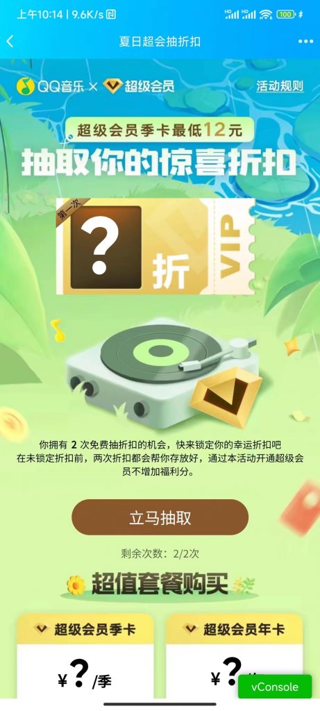 每位用户在活动期间都有两次机会来抽取超级会员的优惠折扣。折扣一旦锁定,将无法更改。具体的折扣抽取概率如下: