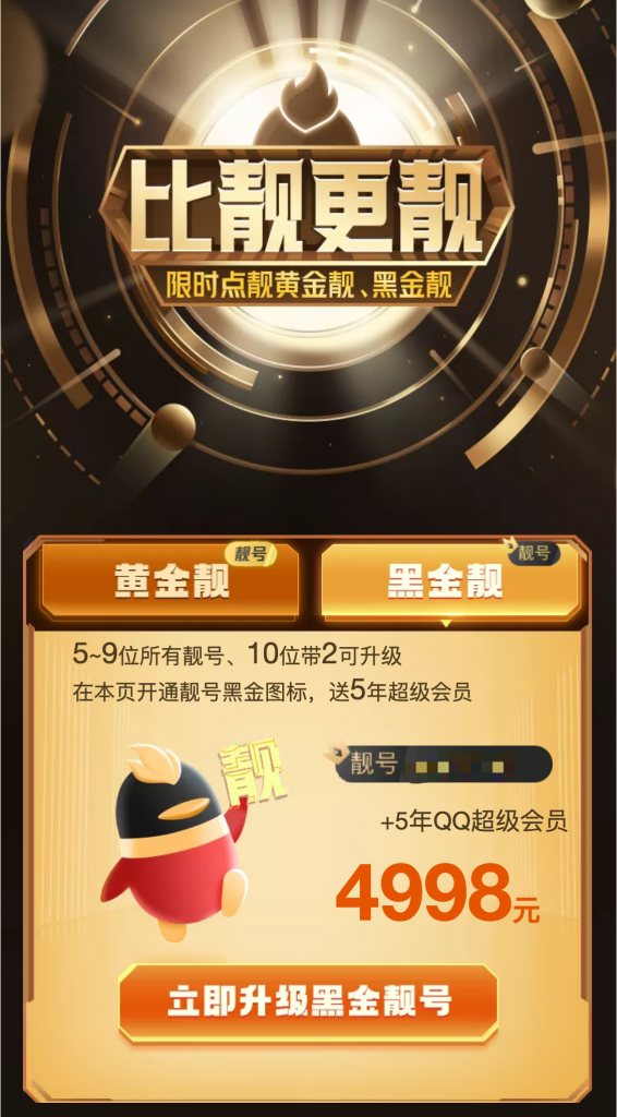 - 您可以在活动页面内升级黑金靓号或黄金靓号,获得对应的靓号图标,此图标可以在手机QQ资料卡、手机QQ账号信息页等多处查看,享受无限尊贵。