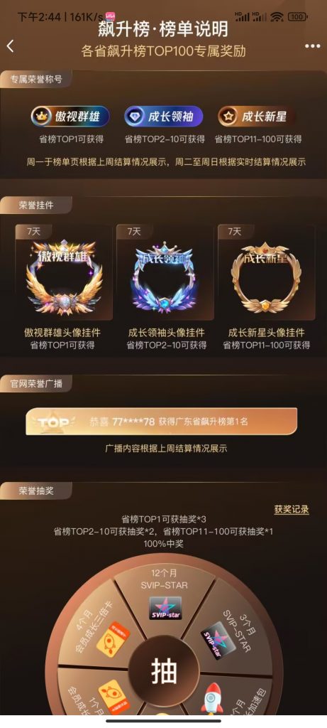 荣誉抽奖: 荣誉抽奖允许每周飙升榜前100名用户参与,奖品包括从1个月的QQ等级加速包到12个月的SVIP-STAR等。这些奖品将为您的QQ等级成长提供显著的加速效果,特别是对于那些寻求QQ等级代练效果的SVIP用户来说,这是一个不可多得的机会。