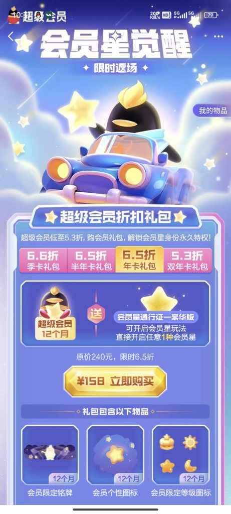 - 年卡礼包:12个月超级会员,包含丰富的等级加速和成长值道具,更有一年等级加速包,等级提升不再是难题。