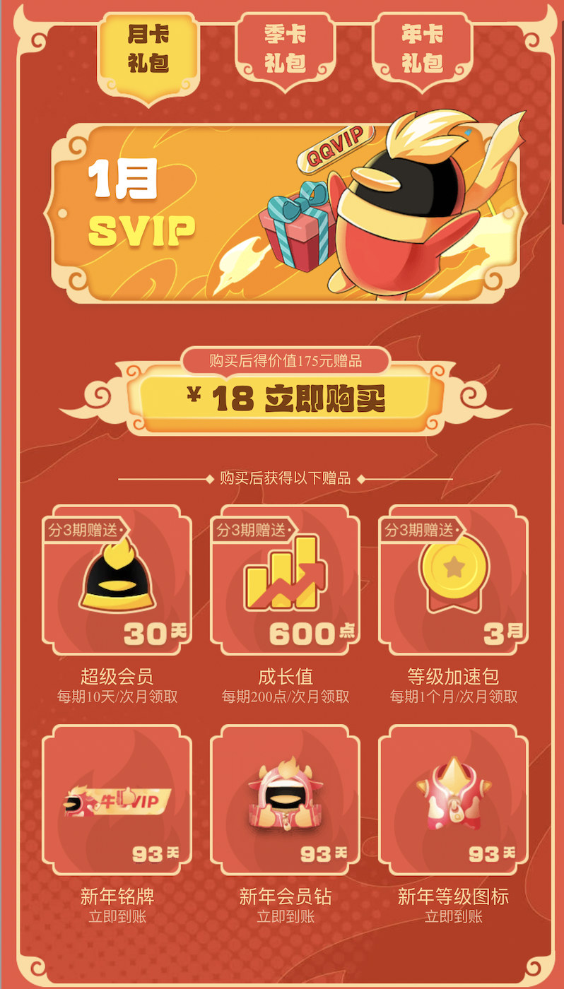 18元 = 30天超级会员 + 30天超级会员 + 600点会员成长值 + 3月等级加速包 + 93天新年铭牌 + 93天新年会员钻 + 93天新年等级图标