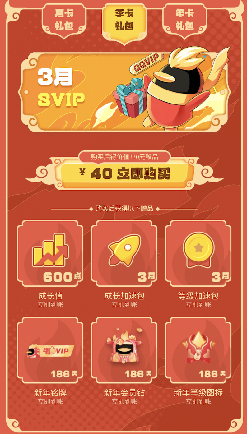40元 = 90天超级会员 + 600点会员成长值 + 3月成长加速包 + 3月等级加速包 + 186天新年铭牌 + 186天新年会员钻 + 186天新年等级图标