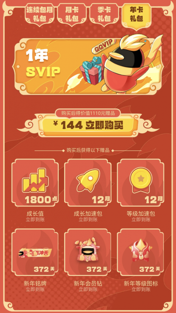 144元 = 360天超级会员 + 1800点会员成长值 + 12月成长加速包 + 12月等级加速包 + 372天新年铭牌 + 372天新年会员钻 + 372天新年等级图标